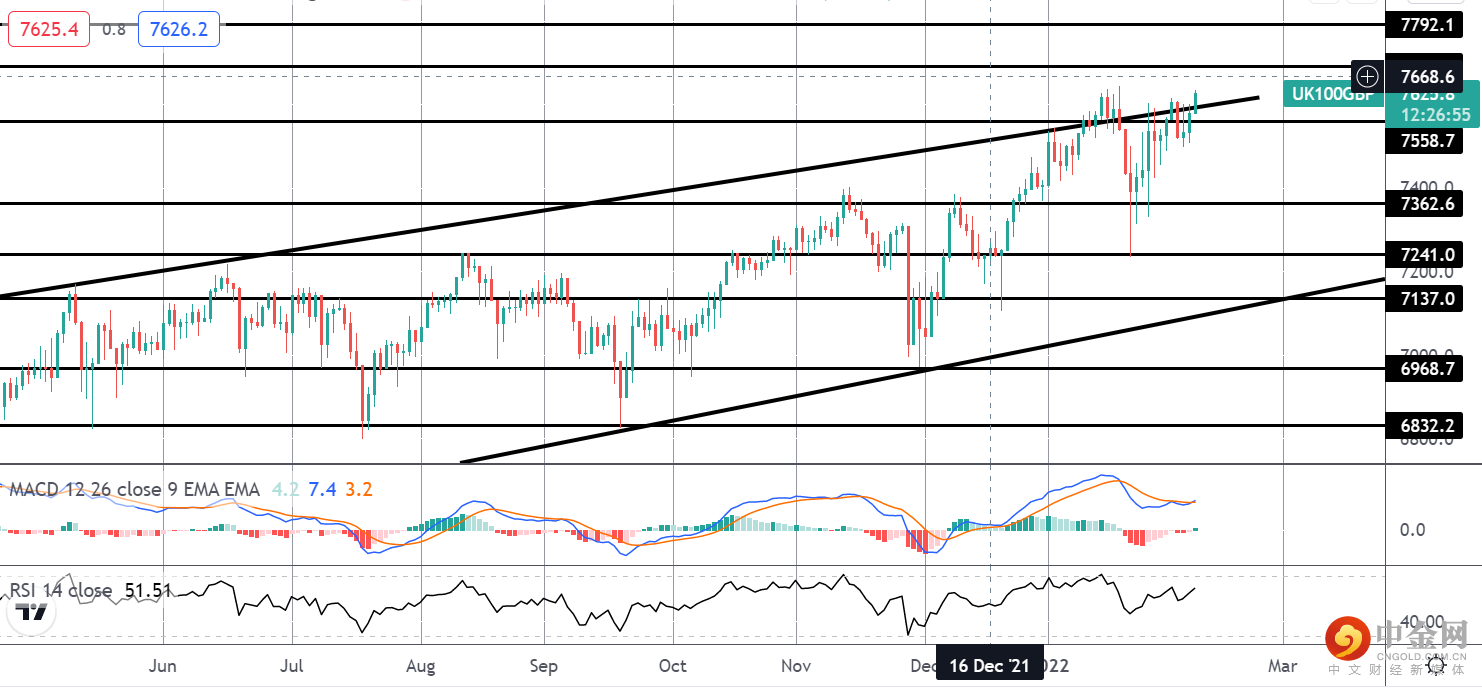 今天从 7241 水平的反弹继续保持良好状态,价格突破了牛市通道顶部。 由于 MACD 和 RSI 均看涨,重点是下一个测试 7691.6 水平,7792.1 是上面需要注意的下一个水平。 不利的一面是,任何修正最初都应在 7362.6 水平上找到支撑。