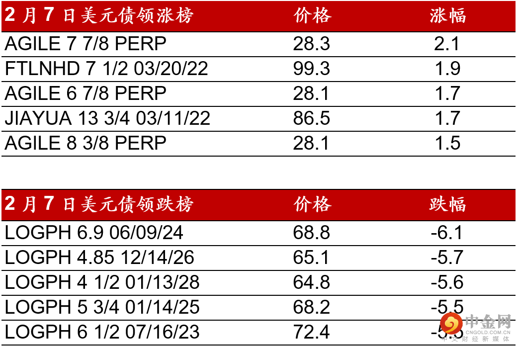 昨日(2月7日),高收益地产板块受市场卖压影响,整体情绪较弱。龙光债券价格早盘一度下跌4-5pts,午后较日内低位小幅回升。合景泰富下跌2-3pts,中骏/碧桂园/建业等仍表现疲弱,全日走低1-2pts。少数表现较好的是雅居乐的前端债券。工业板块方面,除复星国际债券出现少量卖盘外,其他工业板块债券仍受到市场投资者追捧。