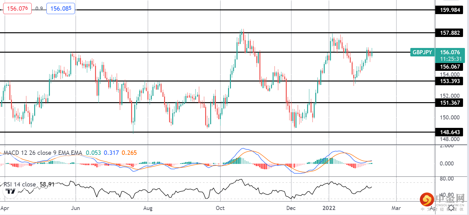 所以,与此同时,我正在寻找一个新的突破。积极的多头突破目前156.57的高点,最初目标是157.88,之后目标是159.98。更保守的数据是157.88点突破159.98点。失效率低于155.17