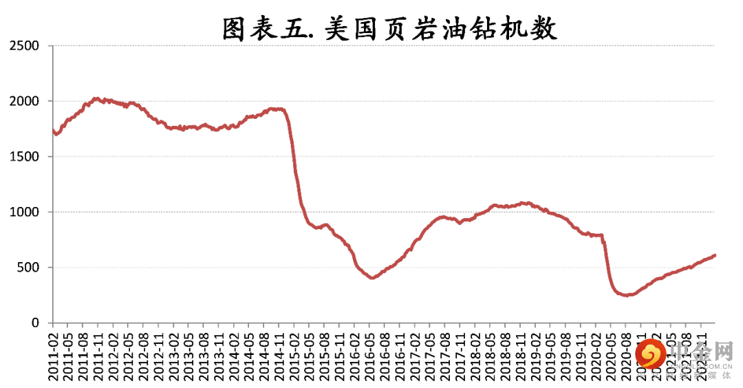 比如我们看到美国的商业原油库存目前处于2014年以来的同期历史最低水平(图表四)。但同时受制于疫情影响,以及拜登政府为了推动碳减排政策而采取的对于页岩油开采的限制政策,美国的页岩油供给量和钻机数较疫情前都有明显的下降(图表五)。虽然我们并不认为全球长期的能源和石油供给存在很大缺口,但是短期看,油价仍将居高不下是大概率事件。