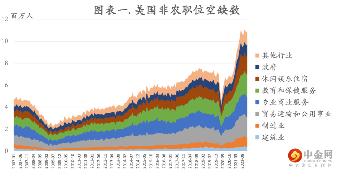 从短期因素看,美国之前采取的极度宽松的货币和财政刺激政策,无疑是导致其通胀上升的重要因素。虽然从去年4季度开始,美国的财政刺激政策逐渐退出,但是我们看到由于美国居民部门在过去2年里累积了较为可观的储蓄存款,同时包括房产和股票在内的居民资产显著增值带来了巨额的财富效应,这就导致了一方面美国的居民部门消费持续复苏并显著超过了疫情之前的水平;另一方面,大量原先从事中低收入工作的美国人不愿意回归就业岗位,尤其在其掌握的储蓄和过去几年获得的资产收入消耗殆尽之前。这就造成了当前美国就业市场中职位空缺数居高不下,大量制造业和服务业无法招聘到足够人手。如图表一所示:2019年末美国的非农职位空缺数为700万个左右,但目前已经高达1100万个,尤其是包括贸易运输、专业服务、休闲娱乐和制造业在内的多个行业职位空缺大幅增加,这就导致了美国目前整体供应链恢复缓慢,港口货物大量拥堵,从而造成了进一步的供给短缺问题。要使得美国供应链基本恢复正常,首先美国的非农职位空缺数需要大体回归到疫情前的水平。美国正常每月新增非农就业人数在20万左右,目前大致在40~50万之间,也就是说这个将近300万人的职位缺口将以每个月30万人左右的时间收敛,则也需要将近10个月的时间。这就意味着,至少在今年上半年,我们将很难看到美国的就业人手短缺情况有彻底缓解。