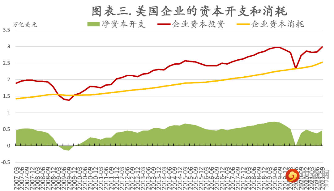 除了这些中短期原因外,也有一些中长期原因在助推美国的通胀压力水平。比如,美国企业的长期资本开支偏低,尤其在疫情发生之后这几年,美国企业的净资本开支(资本投入减去资本消耗)更是较之前水平进一步有所下降(图表三)。这就使得美国在当前疫情影响消退,消费持续提升的情况下大量行业出现了产能不足,产品库存偏低的问题。