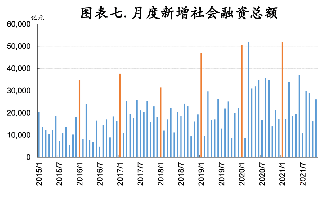 一是政策主动的推动力量,比如通过加快政府投资以及一些促进消费增长和房地产市场稳定的政策。这方面的政策最终的观察点都可以落实到国内社融总量增长的水平上来。也就是说,无论是基建还是房地产,由于当前我国经济自身内生动力不足,居民消费不足的情况短期内很难改观,所以最重要的变量在于社融增长能否有所加快,而由于1月份的新增社融往往对于全年的融资总量和信用松紧程度具有最为重要的意义(图表七),因此观察未来即将公布的1月份新增社融是我们分析国内政策稳增长力度的重要指标。我们认为,1月份的新增社融在5.5~6万亿之间是符合市场预期的。如果超过6万亿,那么对于商品和股市来说,都是一个利好消息。反之,如果低于5.5万亿,市场可能对于经济下行的忧虑会再度升温。