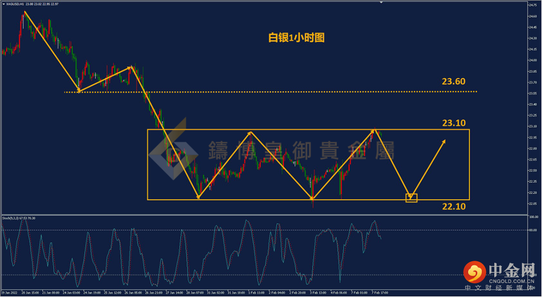 从下方白银1小时周期图看,白银近期位于低位作出箱体整理的技术形态,箱体高低点为22.10-23.10。白银整体以震荡为主,投资者可以尝试在箱体高低点操作高抛低吸。短期白银Stoch技术指标已经处于高位并形成死叉,预计短期会有回落。回落后可以关注箱体下方支撑22.10附近,预计在此位置得到支撑后反弹的概率较大。建议投资者尝试在此位置布局多单。