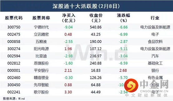 上证指数全天V型翻转,收于日内高位。深证成指盘中一度跌超3%,收低0.98%。大市成交0.88万亿元,上日为0.82万亿。北向资金午后陆续离场,全天小幅净卖出8.17亿元。外资今日延续近期主攻大金融、价值蓝筹为主的沪市风格,日内沪股通净买入21.13亿元,深股通净卖出29.3亿元。净卖出前三个股为宁德时代、药明康德、比亚迪,分别遭净卖出9.04亿元、4.59亿元、2.98亿元。中国平安、招商银行、歌尔股份净买入额位列前三,分别获净买入5.46亿元、3.82亿元、3.3亿元。