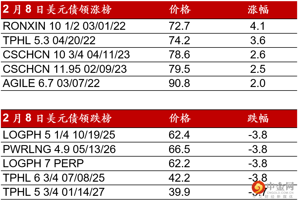 昨日(2月8日),高收益地产板块仍延续上一日疲弱情绪。龙光地产债券在早市受市场卖压影响走低最多5pts,午后价格小幅回升。时代/宝龙/路劲下跌幅度较大,约跌3-5pts, 中骏/旭辉下跌约2-3pts,碧桂园/融创出现少量卖盘,收盘价格小幅下跌1-2pts。华南城/融信的短期债券有较多买盘,小幅上涨0.5-1pts。工业板块整体交投较少。