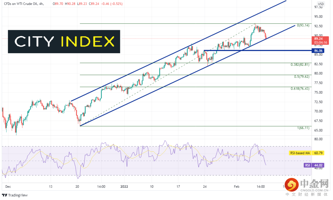 俄罗斯构成OPEC+中的“+”,是整个原油生产链条中的关键生产者。美国与北约盟友不断威胁,如果俄罗斯入侵乌克兰,将制裁俄罗斯。制裁措施从将俄罗斯踢出SWIFT系统到终止Nord Stream 2 Pipeline(俄罗斯-德国天然气输送管道)的协议。入侵的威胁持续存在就足以推高油价。但法国总统Macron本周早些时候与俄罗斯总统普京会晤后表示,俄罗斯军队将在白俄罗斯演习后返回军事基地;得到了普京的保证,不会再向乌克兰边境增兵(虽然后来被普京否认)。该消息帮助西得州油价回到90大关下方。