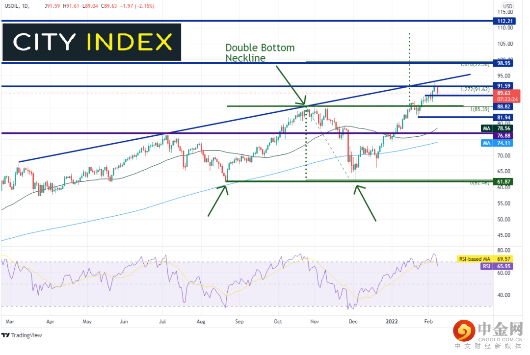 西得州油价周五击穿2021年10月26日高点到12月2日低点行情的127.2%扩展位,即91.62附近,摸至2021年3月8日以来上斜趋势线所在的93.15附近。如果站上该趋势线,可能遭遇由前述行情的161.8%扩展位和2014年6月以来水平阻力位组成的阻力带,即98.95 - 99.56区间。如果攻克该区间,油价可以上看双底目标108.30附近和2014年高点112.21。