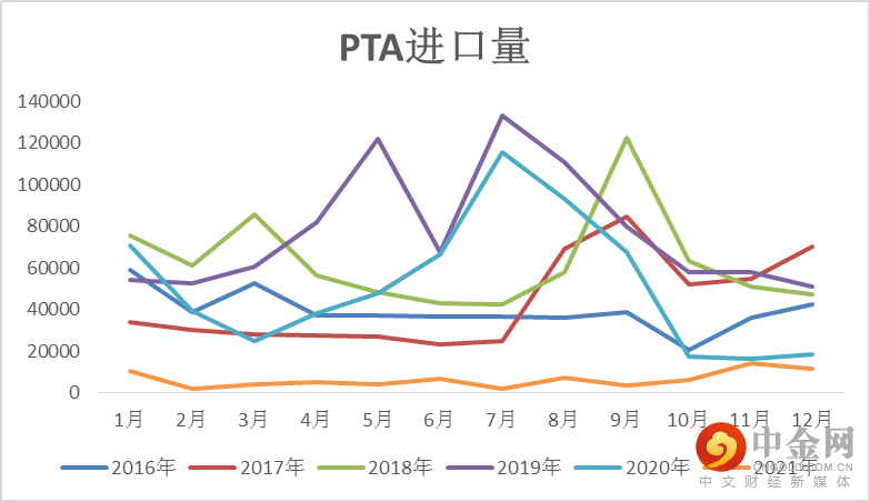 2021年12月我国PTA当月进口量为11253.77吨,累计进口量为76532.48吨,当月进口金额为768.2万美元,累计进口金额为4977.91万美元,当月进口均价为682.66美元/吨,累计进口均价650.43美元/吨,进口量环比下跌20.98%,进口量同比下跌39.10%,累计进口量比去年同期下跌87.58%。