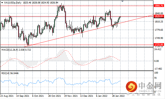 XAUUSD 开始回升至 1828 阻力位,该阻力位至少在之前的三个场合是买家的主要阻碍。长期情绪看涨。动量指标背离,平滑异同移动平均线指标(MACD)接近零线,相对强弱指数(RSI)形成上行轨迹。