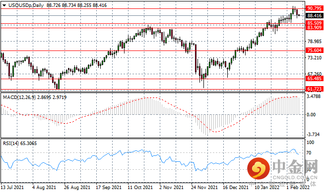 USOUSD 已开始脱离每桶 90 美元的区间,并回到之前的 85.50 至 90.79 价格水平之间的交易区间。 如昨日交易中的长下影线所示,买盘压力依然存在。动量指标开始反转。