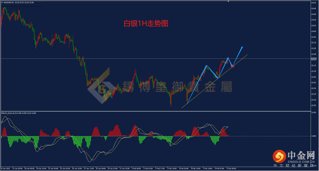 从下图的白银1H周期图来看,白银最低跌至21.98附近后,并进行了二次底部确认,价格开始出现逐步上涨;从形态来看,白银价格高点在逐步走高,低点也在逐步抬高,走出小级别上涨趋势,目前上涨趋势运行良好,日内可关注上涨趋势线的支撑效果;结合MACD指标来看,DIFF与DEA双线处于零轴上方多头区域,但有死叉往下的迹象,表明短线空头有回调的需求,日内可等待价格回踩23.00附近尝试多单。