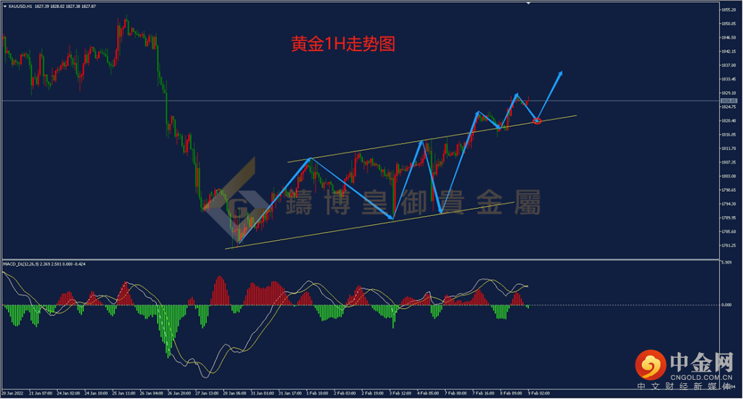 从黄金1H周期走势结构看,昨日黄金上破1823附近压力后,今日亚盘价格处于高位震荡整理,从形态上看,黄金价格高点不断创新高,低点也逐步抬高,短线上涨趋势运行良好,日内可以尝试顺势低多为主;结合MACD指标来看,DIFF与DEA双线处于零轴上方,但有死叉向下迹象,表明短线空头有回调的概率,日内可等待价格回踩1819.0附近尝试多单。