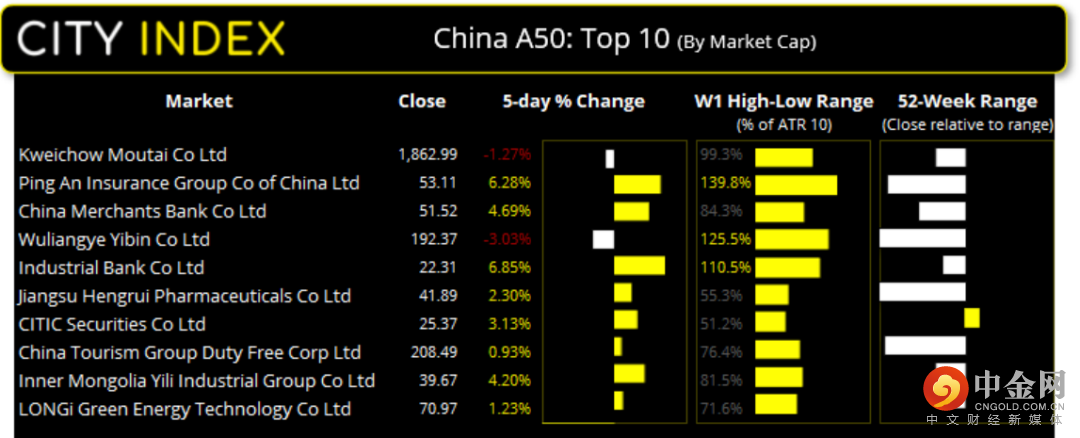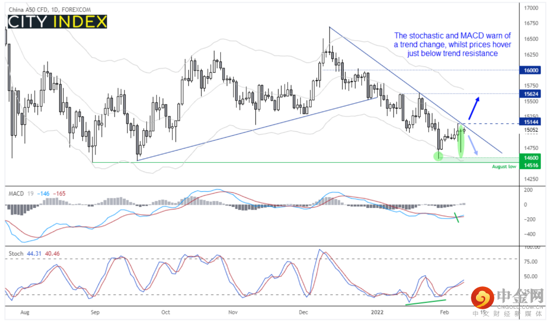 中国A50指数已自12月最高点回落逾12%,今年迄今跌幅在3%左右。股指跌势止步于8月低点14,516上方且形成下影线(表明4,600附近存在买需),之后在Keltner通道下轨内反弹并反击了20天指数移动均线。中国A50指数昨天先是下跌,后在干预报道作用下反弹,收出一根看涨pinbar、构筑上抬的低点。