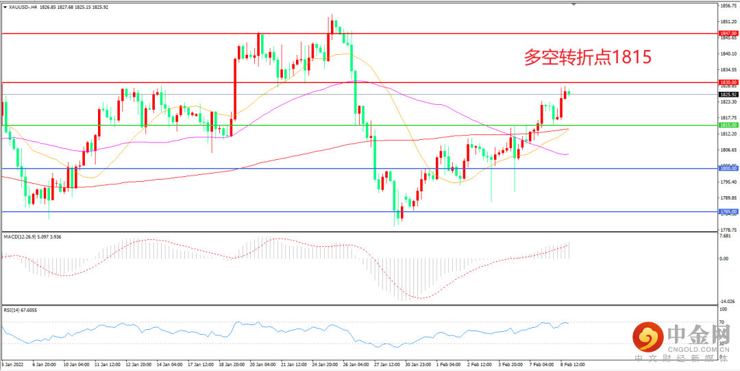现货黄金周二继续上涨,创两周新高,一度触及1828美元。本交易日亚盘,现货黄金暂维持涨势,在1827美元附近交投。美国2021年12月消费者物价指数(CPI)上涨7%,创下近40年来新高,市场预期即将公布的1月CPI可能升至7.3%。美国通胀压力至今未能缓解,即将公布的1月份美国CPI若是再度爆表,势必将推升对升息周期的预期,不排除3月升息可能提高至50个基本点,届时恐怕将对金价的走势不利。但市场分析提到,金价多头延续上行势头不变,目标1853美元。