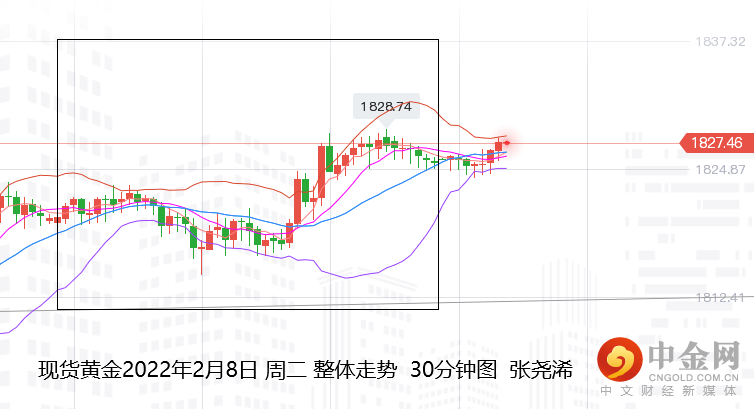 上交易日周二(2月8日):国际黄金伦敦金继续走强收涨,且稳于中轨之上。
