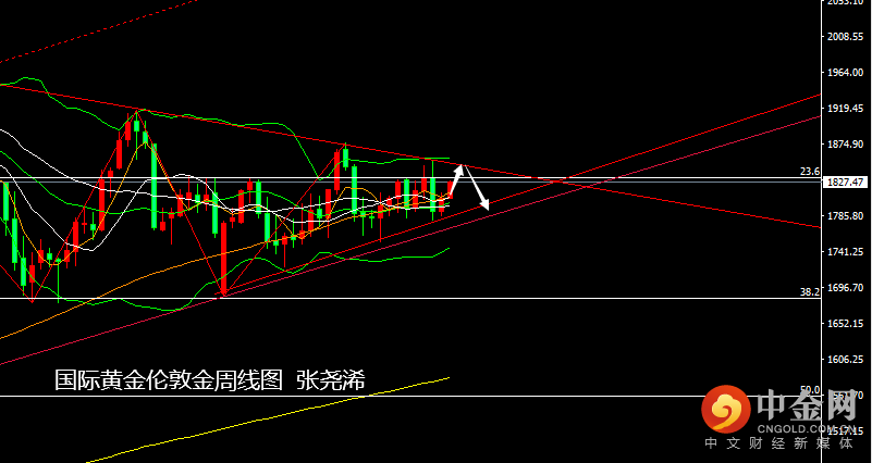 技术上:周线级别:金价本周保持走强,稳于中轨及百周线等上方,附图指标信号仍维持看涨,主图有进一步触及23.6%回撤线1832美元附近的预期,再根据图中给出的三角趋势看,以及主图1877美元而下的力度未有触底迹象的暗示,这波反弹将首先看至1832美元,然后至趋势线压力附近的1847美元附近,触及将可看回落。