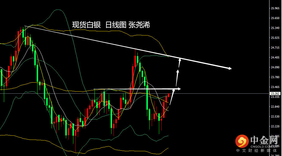 日图上,银价初步突破中轨阻力,附图指标看涨信号也维持强劲状态,暗示后市仍有进一步走高空间。操作可逢低做多。