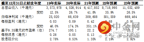 我们预测公司2021-2023年的收入分别为64亿港元、87亿港元和110亿港元,归属于母公司的净利润分别为3.1亿港元、5亿港元和6.7亿港元。根据同类公司的估值情况,我们给予公司目标价为15港元,对应2022年的22倍PE,较现价有60.4%的上涨空间,给予买入评级。