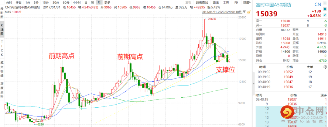 从技术分析来看,A50处于月线支撑位,也就是前期的高点,关注该点位能否反弹。支撑点位:15000。如果在15000点没有破位,A50大概率将筑底反弹。