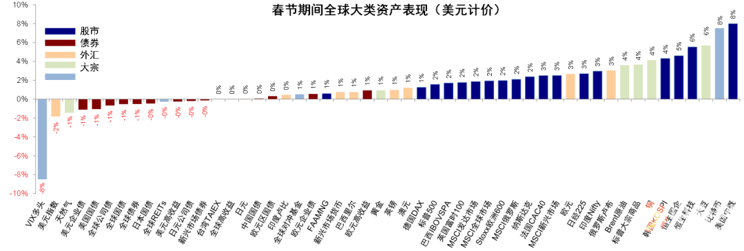 )春节假期期间,海外市场整体表现平稳,欧美主要股市普遍从底部反弹,尽管期间仍有波动。