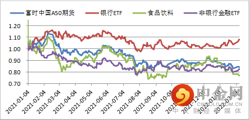上周,A50在底部支撑位反弹,三大主要板块涨跌不一。银行板块和非银金融上涨,食品饮料不断走弱,A50期货2202合约上涨1.7%。