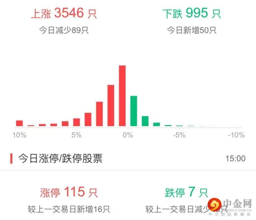 个股方面,赚钱效应明显。Wind数据统计,两市共计上涨3546只,下跌995只;涨跌停方面,涨停115只,跌停7只。