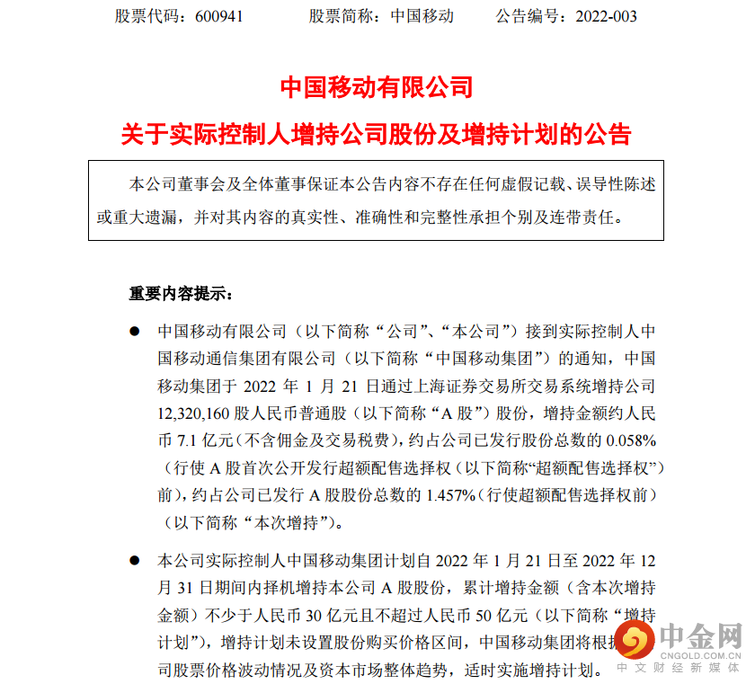1月27日,中国移动的增持公告显示,公司于1月21日至1月27日期间,增持2620.82万股股份,累计增持金额约15.09亿元。