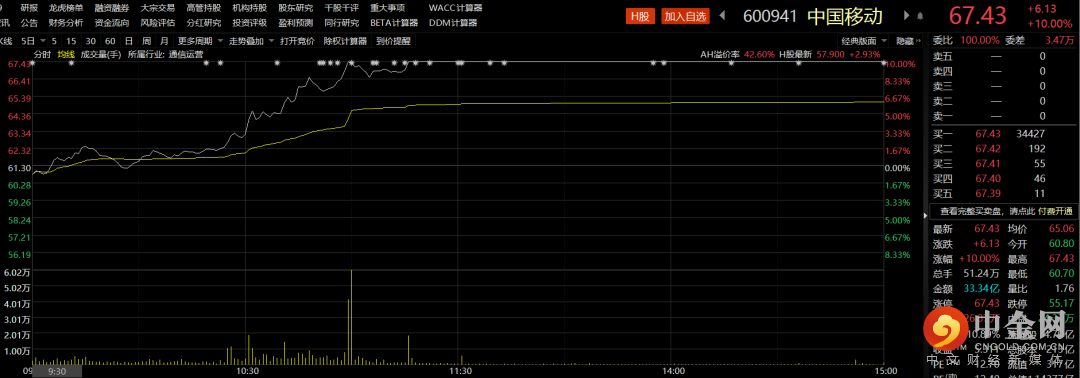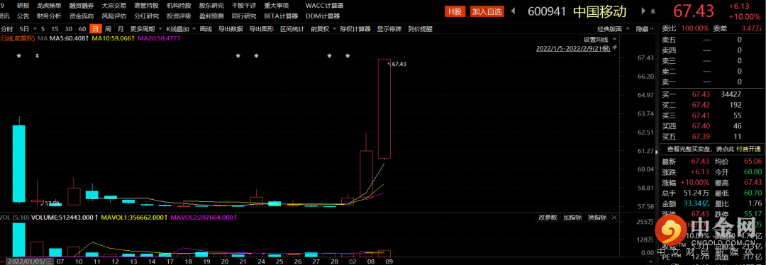 回看昨日盘面热点,权重股中国移动的暴涨是出乎意料的。开盘小幅低开后迅猛拉升,股价创上市以来新高,报67.43元,涨幅达10%,总市值1.44万亿元。目前总市值超过了中国石油和中国平安,位居A股第四位。