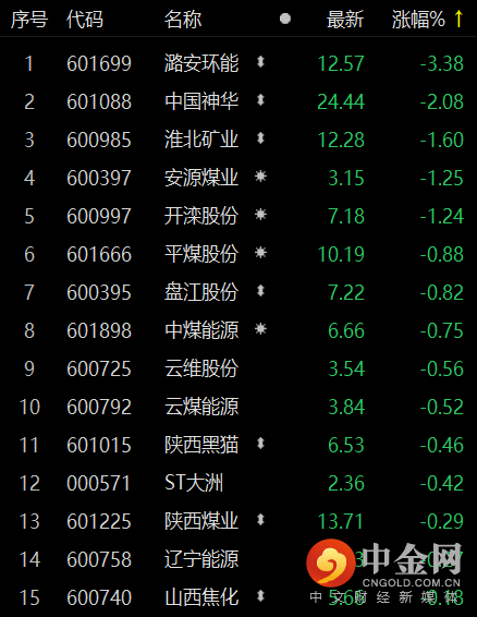 数字货币概念满屏涨停的同时,煤炭指数由涨转跌,部分煤炭个股午后跌势明显,潞安环能跌3.38%、中国神华跌2.08%、淮北矿业跌1.60%。