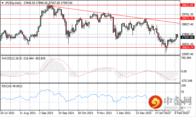 JP225 在反弹中段停滞,因为看跌活动已开始抑制买方在前几个交易日取得的部分收益。过去的任何恢复尝试都被作为该指数阻力区的趋势线所包含。