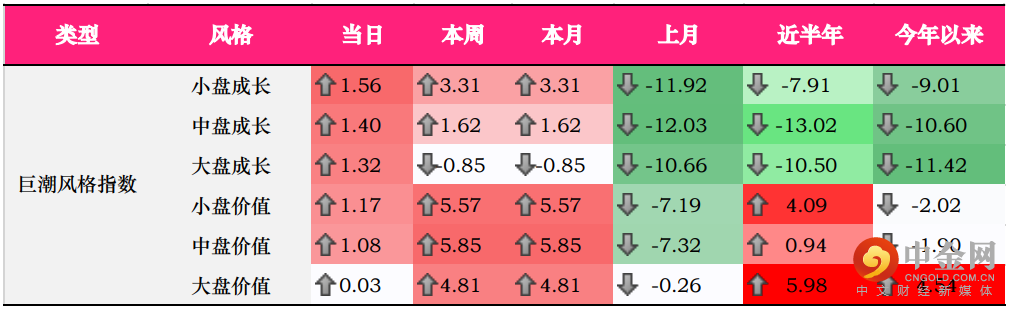 巨潮风格指数方面,自上一日小盘价值大幅收涨后,小盘成长接下“接力棒”,当日上涨1.56%;成长风格表现明显强于价值风格,但小盘价值仍旧抢眼,上涨1.17%。