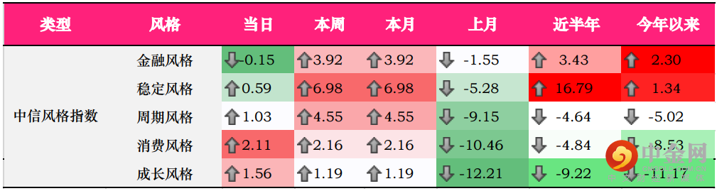 中信风格方面,金融风格略有回调,当日下跌0.15%;稳定风格涨幅也有所回落,当日小幅收涨;而在白酒的带领下,消费风格强势反弹,上涨2.11%。
