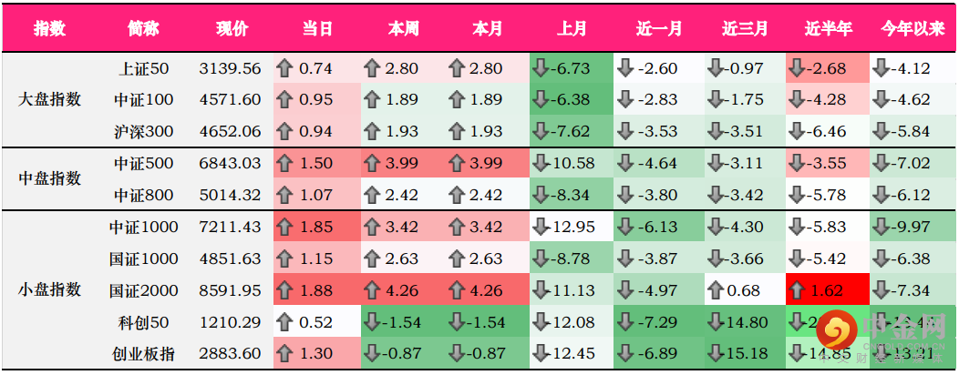 大、中、小盘指数方面,当日各指数均有不同程度的上涨;而小盘指数中的国证2000、中证1000则持续强势表现;其中,国证2000涨1.88%,收于8591.95点,中证1000上涨7211.43点;双创也结束下跌态势,科创50上涨0.52%,创业板指上涨1.30%;大盘指数表现稳定,但相较部分小盘指数来说涨幅趋弱。