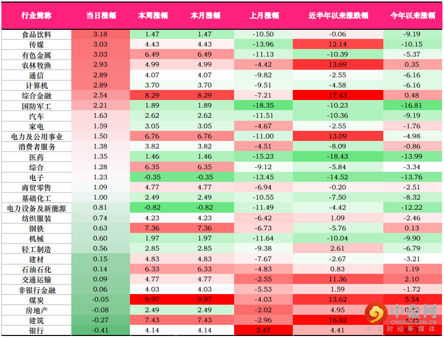 昨日,涨幅前三的中信一级行业为:食品饮料(3.18%)、传媒(3.03%)、有色金属(3.03%);跌幅前三的中信一级行业为:银行(0.41%)、建筑(0.27%)、房地产(0.08%)。