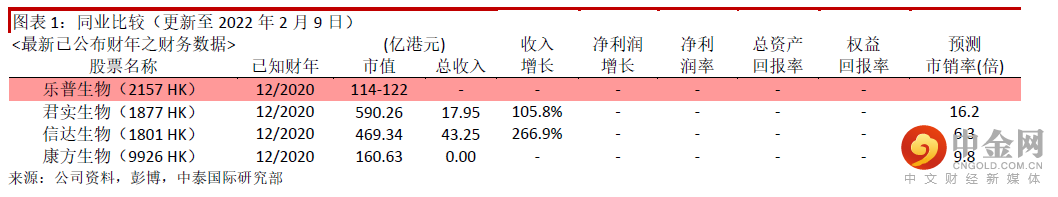 同业比较及估值水平:我们选取研发PD-1创新药物的君实生物(1877 HK)、信达生物(1801 HK)、康方生物(9926 HK),2022年行业的预测市销率平均为10.8倍。按全球公开发售后的 16.6亿股本计算,公司市值为114-122亿港元。
