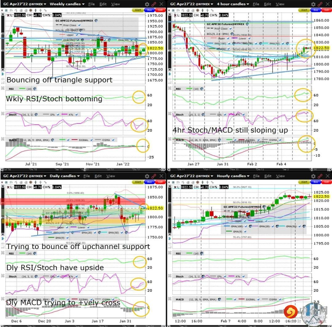周线图、日线图和4小时图上的相对强弱指数RSI、随机指标和MACD均位于底部或正反弹。
