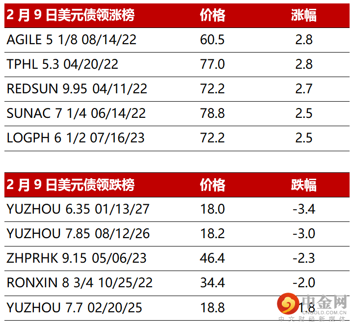 昨日(2月9日),高收益地产板块整体情绪有所好转。龙光地产债券在澄清更换审计师传闻公告发出后整体上涨2-3pts。碧桂园/路劲/合景泰富/融创/中骏等债券出现少量买盘,小幅升高1-2pts。正荣/融信/雅居乐/弘阳等短端债券看到市场投资者买入兴趣,收盘价格上涨约1pts。工业板块方面,广汇汽车在评级下调后下跌1pt左右,澳博控股上涨1pt。