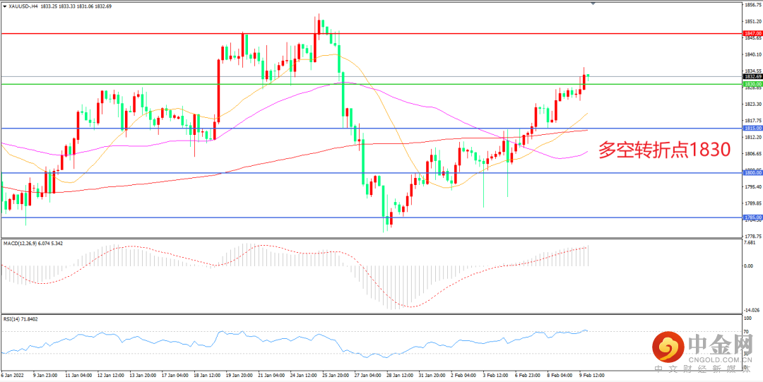 4小时图看,金价长阳拉升后突破整理区间,整体表现偏强,短期均线拐头向上,MACD红柱增加,RSI指标走平,日内震荡上行概率较大。