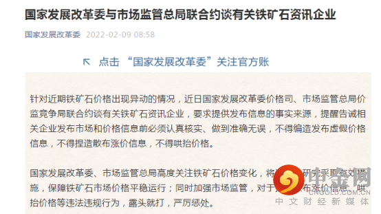 昨日,据国家发改委官方微信公众号消息,针对近期铁矿石价格出现异动的情况,近日国家发改委价格司、市场监管总局价监竞争局联合约谈有关铁矿石资讯企业,要求提供发布信息的事实来源,提醒告诫相关企业发布市场和价格信息前必须认真核实、做到准确无误,不得编造发布虚假价格信息,不得捏造散布涨价信息,不得哄抬价格。