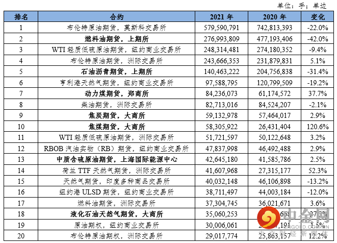 表4:2021年全球能源期货和期权成交前20位