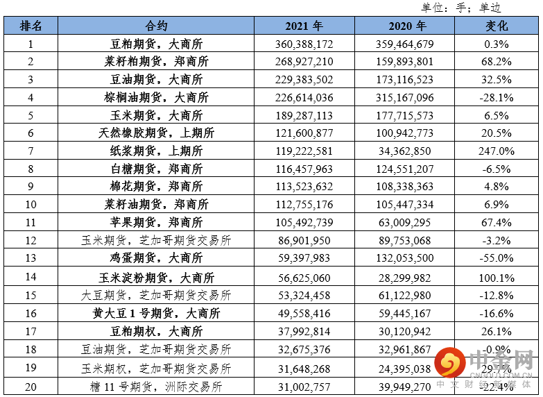 表2:2021年全球农产品期货和期权成交前20位