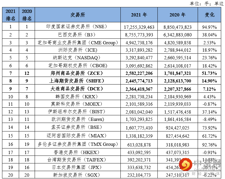 表1:2021年全球前二十衍生品交易所