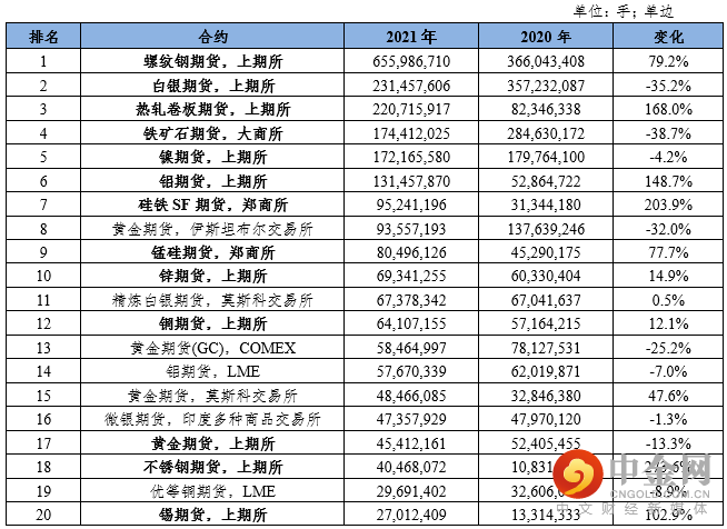 表3:2021年全球金属期货和期权成交前20位