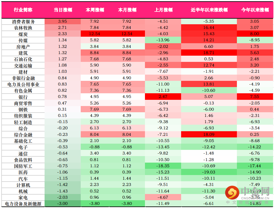 昨日,涨幅前三的中信一级行业为:消费者服务(3.95%)、农林牧渔(2.71%)、煤炭(2.33%);跌幅前三的中信一级行业为:电力设备及新能源(3.00%)、家电(2.03%)、机械(1.43%)。