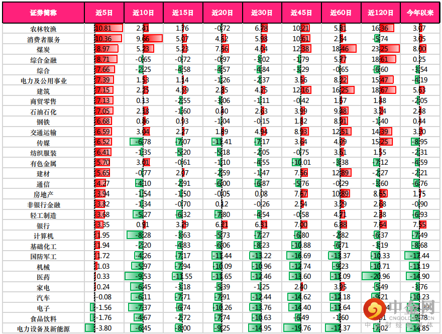 通过对各行业的周期涨跌幅的观察,我们可以找到近期涨幅较好的行业,如农林牧渔、消费者服务、煤炭、综合金融,这些行业是近期的热点行业。对于一些短线交易者来说,热点内或存在一定的“动量效应”。