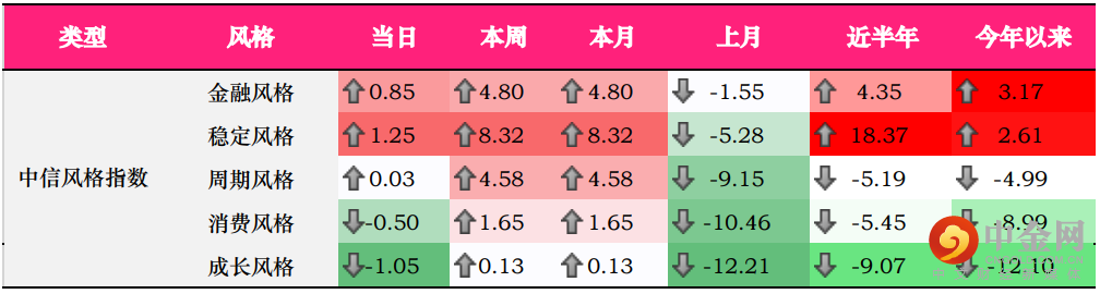 中信风格方面,金融风格、稳定风格彰显抗跌能力;其中,金融风格、稳定风格分别上涨0.85%、1.25%。