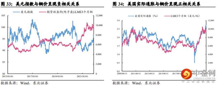 流动性因素和加息影响:2022 年美联储加息确定性加强,美元上涨,大宗商品价格预计将承压,但中长期看,流动性对商品价格影响多发生于流动性预期反转时刻,和美股走势类似,2022 年下半年加息对铜价的影响将放缓。