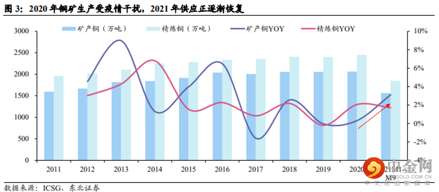 受疫情冲击,2020年铜矿供应弹性相对不足,据 ICSG数据,2020年全球矿产铜产量为 2063.4万吨,同比仅增加 0.3%。但随着疫情缓解后企业复工复产。全球 17 家主流铜矿企业 2022-2023年产量同比增速分别为 7.6%、5.2%。关注投资机会: