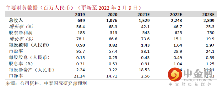 我们上调公司 2021 年盈利预测。考虑到短期内国内新冠反复可能对公司经营仍有轻微影响,我们将 2022-23E 收入预测轻微下调 2.5%、4.4%,股东净利润预测轻微下调1.1%、4.3%,但是公司业绩仍将维持快速增长,预计 2020-23E 股东净利润 CAGR 将高达